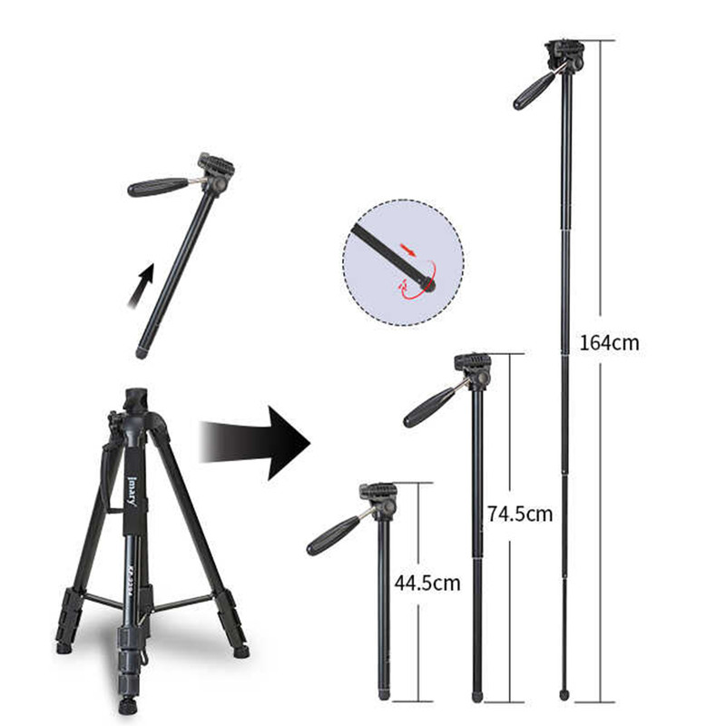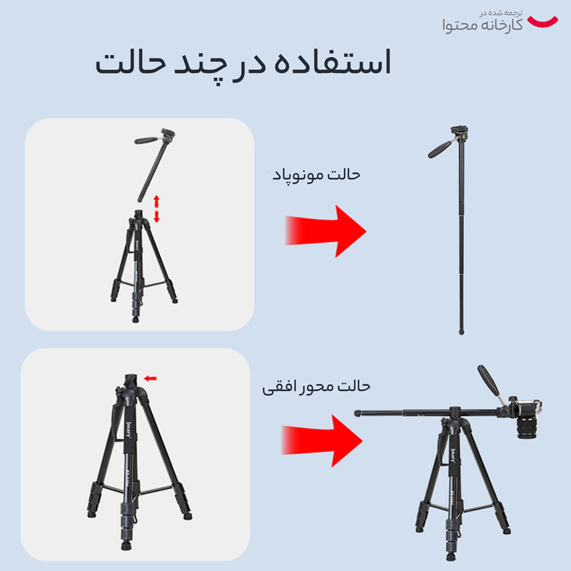 | سایر مشخصات | -----قابل استفاده در ابعاد 1790mm - 1165mm - 855mm - 600mm-----چرخش 180 درجه عمودی و 90 درجه افقی-----زاویه عکاسی پانوراما با چرخش 360 درجه-----قلاب حمل زیر سه پایه-----قابل استفاده به عنوان مونوپاد در 3 طول مختلف (164cm-74.5cm-44.5cm) |