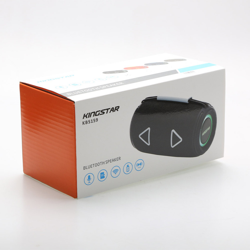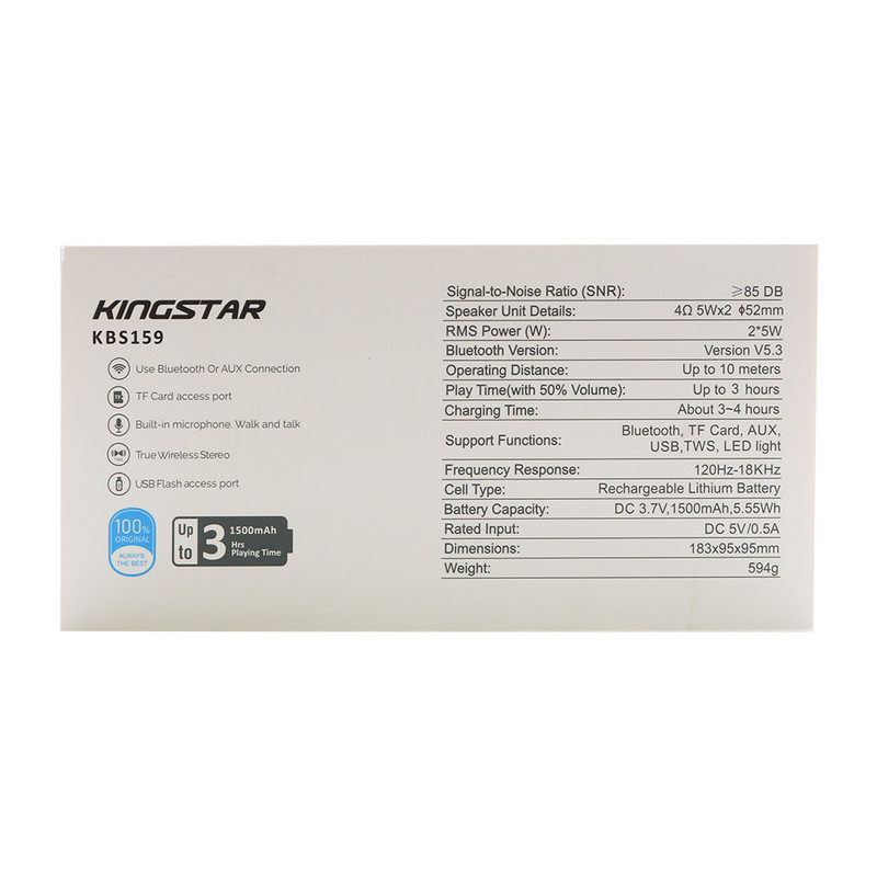 اسپیکر بلوتوثی قابل حمل مدل KBS159 از محصولات جدید کمپانی کینگ استار است. از جمله ویژگیهای بصری این اسپیکر میتوان به بدنه پلاستیکی به ابعاد 183*95*95 میلیمتر و وزن 594 گرمی در کنار نوپردازی RGB آن اشاره کرد. این ابعاد در کنار بند موجود در پشت اسپیکر موجب شده تا این محصول تبدیل به یک کالای قابل حمل و جذاب شود. بر روی این اسپیکر 5 دکمه بزرگ تعبیه شده که شامل دکمه خاموش و روشن، کاهش و افزایش صدا، تغییر مود و PLAY/PUSE و تغییر نورپردازی است. همچنین در قسمت پشتی آن با کنار زدن پوشش لاستیکی، درگاه Type-C جهت شارژ اسپیکر و ورودی های کارت حافظه MicroSD (با فرمت FAT32)، درگاه USB (با فرمت FAT32) و جک 3.5 میلی متری را مشاهده خواهید نمود. KBS159 در 4 رنگ قرمز، مشکی ، خاکستری و سرمه ای، دارای 10 مدل نورپردازی متفاوت نیز میباشد. در تشریح ویژگی های داخلی محصول، میتوان به وجود 2 بلند گوی 5 واتی (در مجموع 10 وات توان خروجی) با قطر 52 میلی متر و مقاومت 4 اهمی اشاره کرد. همچنین بلوتوث نسخه 5.3 با محدوده عملکرد 10 متر، امکان استفاده از این تکنولوژی در فضای باز را به ما میدهد. وضوح صدای پویا و شفاف در بخش جلویی اسپیکر هنگام پخش موسیقی، توجه هر کاربری را به خود جلب میکند. وجود میکروفون و قابلیت مکالمه از طریق اسپیکر از دیگر ویژگی های این محصول میباشد. مدت زمان پخش اسپیکر با صدای 50 درصد بیش از 3 ساعت بوده و مدت زمان مورد نیاز جهت شارژ اسپیکر از صفر تا صد حدود3 الی 4 ساعت میباشد. منبع انرژی این کالا باتری لیتیوم پلیمری 3.7 ولت 1500 میلی آمپری است. فناوری True Wireless Stereo یا به اختصار TWS یک راه ارتباطی بر پایه فناوری بلوتوث است که امکان برقراری اتصال بدون سیم را فراهم کرده است و از آن طریق میتوان صدایی Stereo با دو کانال صوتی چپ و راست را پخش کرد. این قابلیت در اسپیکر KBS154 موجب پرطرفدار شدن آن شده است. جهت فعال سازی قابلیت TWS به دفترچه راهنما همراه محصول مراجعه شود. در نگاه تخصصی تر، این اسپیکر با نسبت سیگنال به نویز 85 دسی بل و پاسخ فرکانسی 120Hz-18KHz از اسپیکر های با کیفیت بازار به شمار میآید. همچنین میزان حداکثر ورودی شارژ آن 5V/0.5A است.